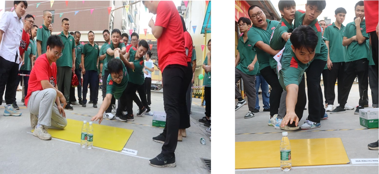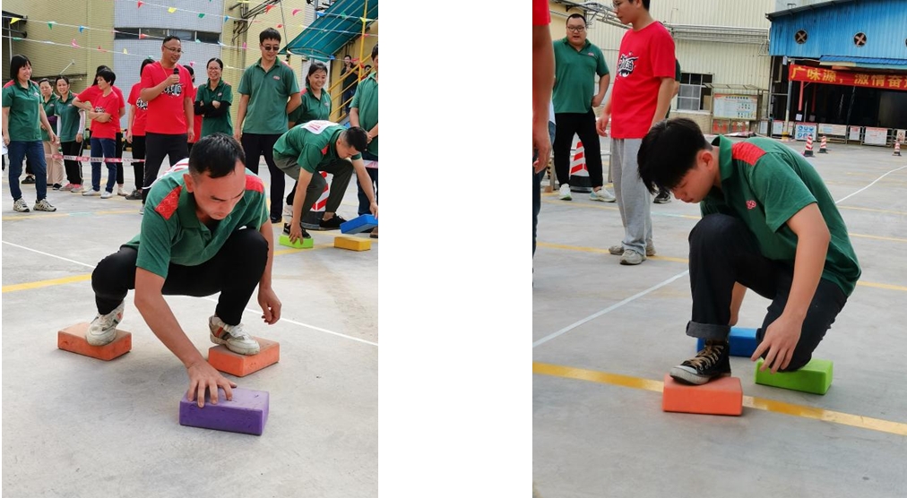 第五個(gè)項(xiàng)目:摸石頭過河。每名隊(duì)員手拿三塊磚頭過河,6名隊(duì)員接力完成,每人走10米。這個(gè)項(xiàng)目手腳的協(xié)調(diào)性要求很高,有些隊(duì)員為了不犯規(guī)加時(shí),用最簡單的辦法三塊磚前后移動(dòng),也是一個(gè)非常棒的辦法,本項(xiàng)目在有條不紊的比賽中充分體現(xiàn)了廣味源人務(wù)實(shí)篤行,行穩(wěn)致遠(yuǎn)的合作態(tài)度。