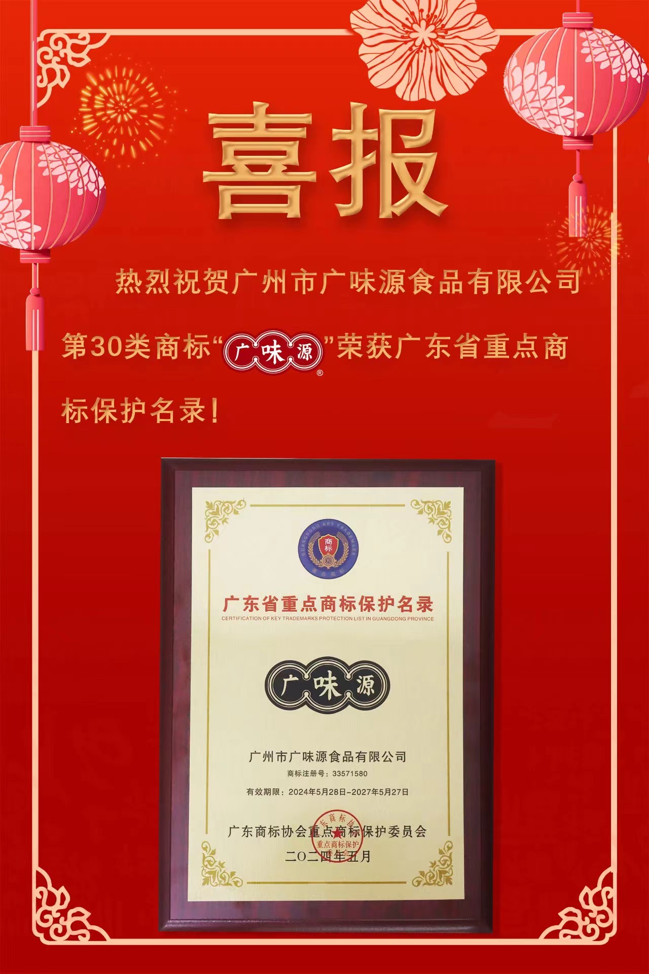 熱烈祝賀廣州市廣味源食品有限公司第30類商標(biāo)榮獲廣東省重點商標(biāo)保護名錄!